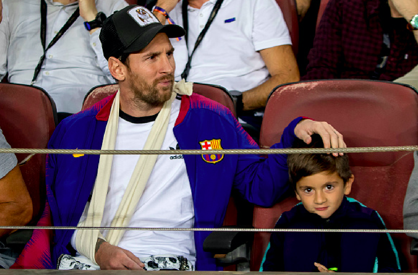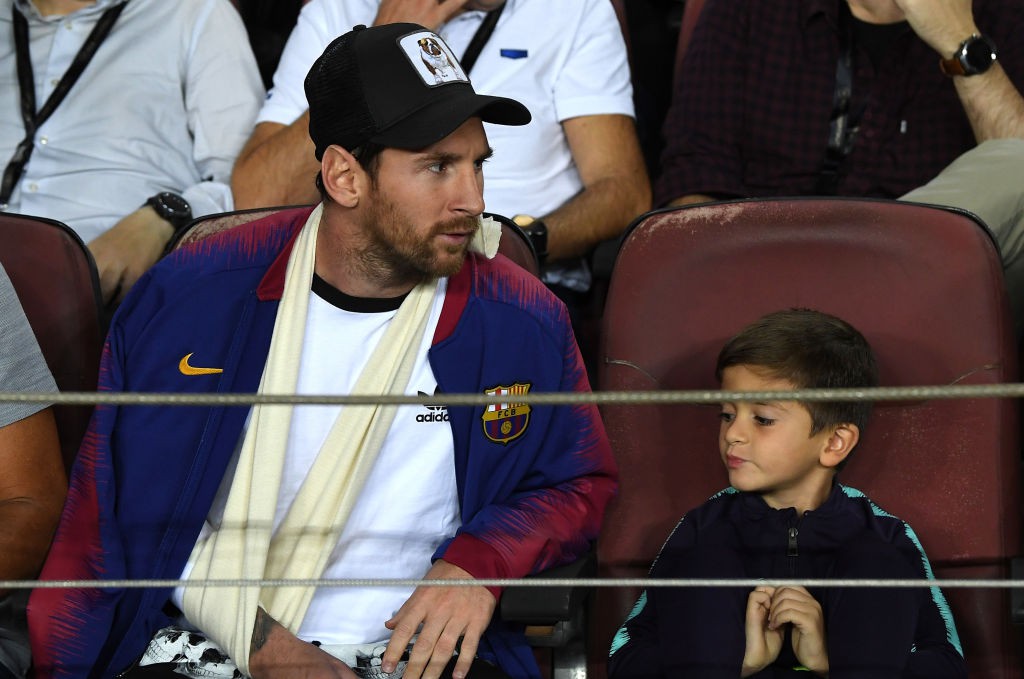 Dù đang bó bột cánh tay phải rất bất tiện, Messi vẫn đến xem đội bóng thân yêu thi đấu. Đi cùng anh là cậu con cả Thiago.