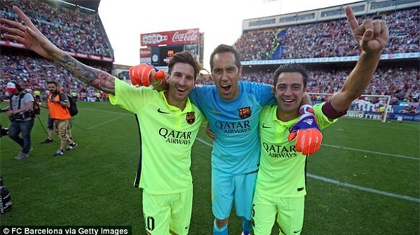 Messi, thủ thành Bravo và Xavi ăn mừng chức vô địch La Liga của Barcelona.
