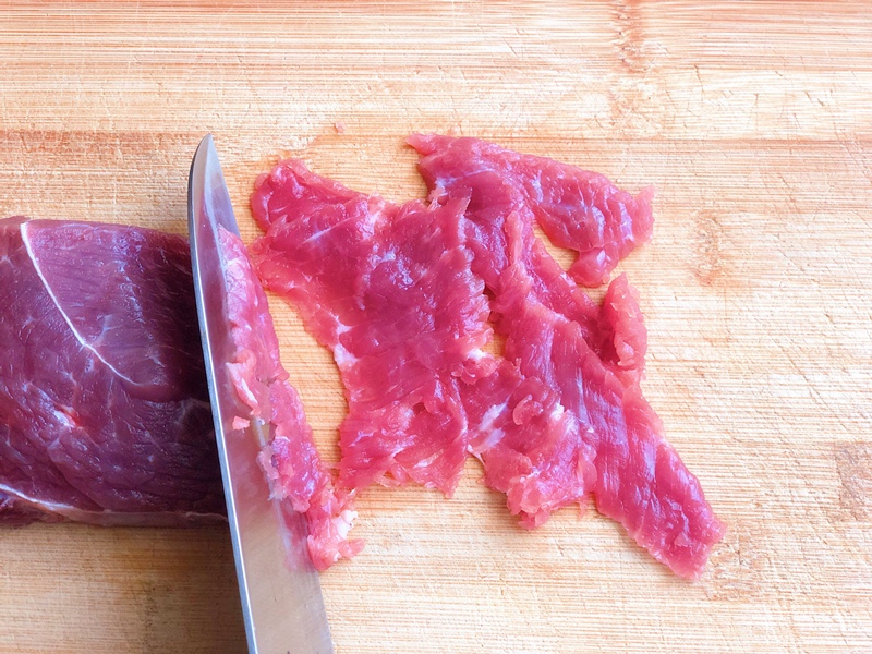 Thịt bò sơ chế sạch, thái thành lát mỏng.