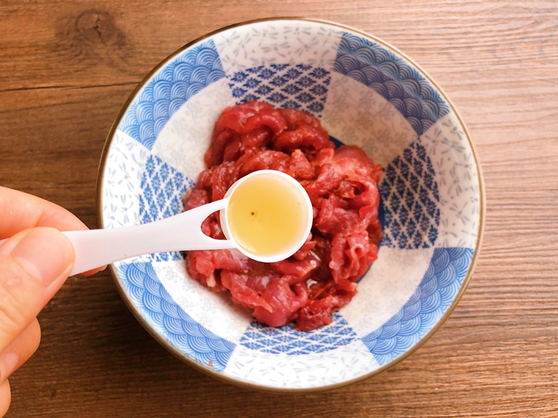 Cho thịt vào bát rồi thêm muối, rượu nấu ăn, nước tương vào trộn đều.