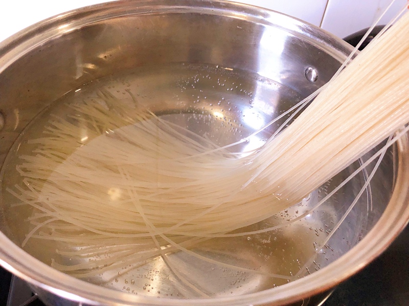 Đun sôi lượng nước thích hợp trong nồi, cho mì gạo vào luộc chín.