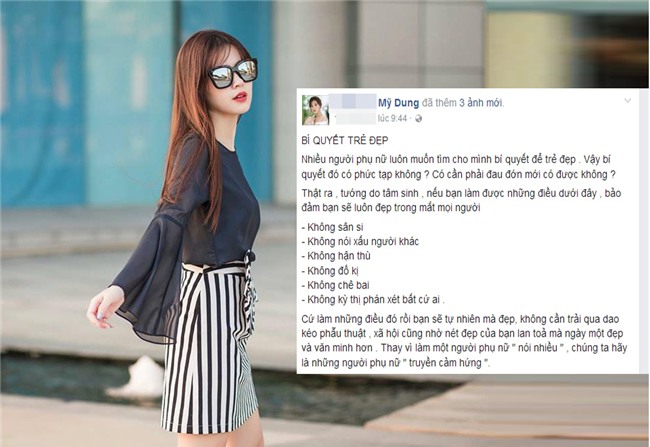 Sau khi dùng hành động chứng minh nhan sắc "cha sinh mẹ đẻ", Mỹ Dung đã bật mí bí quyết trẻ đẹp trong chia sẻ mới đây. Theo nữ diễn viên Thiên mệnh anh hùng, "tâm sinh tướng" chính là bí quyết bỏ túi cho những cô nàng muốn sở hữu vẻ đẹp tự nhiên.