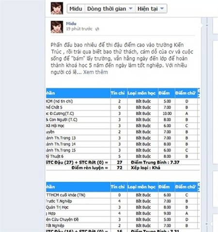 Trong lúc "dầu sôi lửa bỏng" về việc Angela Phương Trinh bỏ thi tốt nghiệp, sở hữu bảng điểm thấp lè tè….khiến cô phải viết tâm thư tha thiết yêu cầu giới truyền thông tôn trọng quyền tự do cá nhân và gia đình. Cùng lúc đó, trên tráng cá nhân của mình Midu lại đăng tải bảng điểm đại học với những thành tích khá.