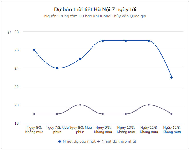Ngày 9-10/3, khu vực hửng nắng và nhiệt độ tăng nhanh lên mức cao nhất 31 độ C, người dân có thể cảm thấy oi nóng. Ban đêm, mức nhiệt cũng tăng nhẹ lên ngưỡng 21 độ C.