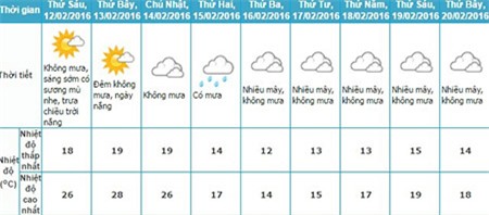 đêm, ban ngày 15-18 độ C, trời rét đậm. Ngày đầu tuần tới (15/2) sẽ xuất