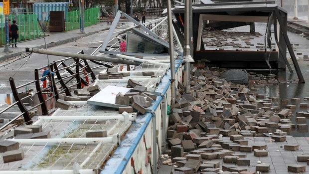 Một con đường bị hư hỏng nặng khi sóng đánh vào bờ biển ở Ulsan, Hàn Quốc. Cơn bão mạnh nhất đổ bộ vào Hàn Quốc trong nhiều năm đã tàn phá phần phía Nam đất nước, đốn hạ đường dây điện, khiến 20.000 ngôi nhà mất điện khi hàng nghìn người phải sơ tán.