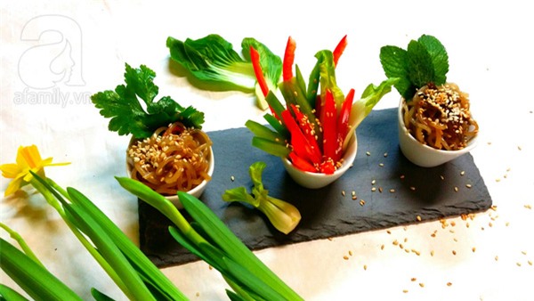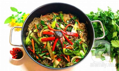 ![]() | ![]() Cho đĩa rau đã xào và dầu mè vào, trộn đều, nêm nếm lại cho vừa ăn thì tắt bếp. Lấy miến trộn kiểu Hàn Quốc ra đĩa, cho tiêu và trang trí ngò cùng mè rang lên trên, dùng nóng với nước tương và ớt. |