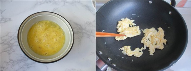 Đập trứng vào bát đánh tan. Đổ một ít dầu ăn vào chảo đun nóng, cho trứng vào đánh tơi trứng rồi trút ra đĩa.