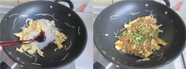 Đun nóng chảo với một ít dầu ăn, cho giá đỗ và gốc hành thái nhỏ vào xào qua tiếp đó thêm miến vào đảo chung.