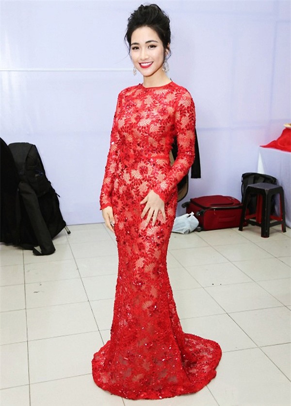 Hòa Minzy như bị nuốt trọn vóc dáng thấp bé trong chiếc đầm đuôi cá màu đỏ đính kết cầu kì