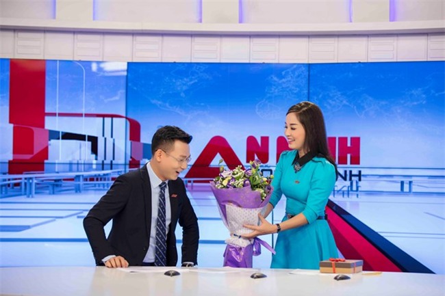 trường quay chương trình An ninh toàn cảnh. Nữ MC ôm theo một bó hoa và