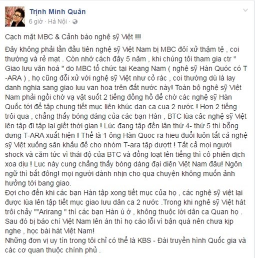Lúc đang tập đến lần thứ 4, thứ 5 thì bỗng dưng T-ara xuất hiện. Thế là một người Hàn Quốc ra hiệu đuổi tất cả nghệ sĩ Việt xuống sân khấu để T-ara tập dượt", Minh Quân kể trên trang cá nhân.