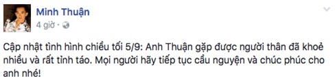 Ngoài Phương Thanh, Cát Phượng, người đang quản lý trang page của Minh Thuận trên mạng xã hội cũng cập nhật dòng trạng thái xác nhận có nội dung: "Cập nhật tình hình chiều tối 05/09: Anh Thuận gặp được người thân đã khoẻ nhiều và rất tỉnh táo. Mọi người hãy tiếp tục cầu nguyện và chúc phúc cho anh nhé!".