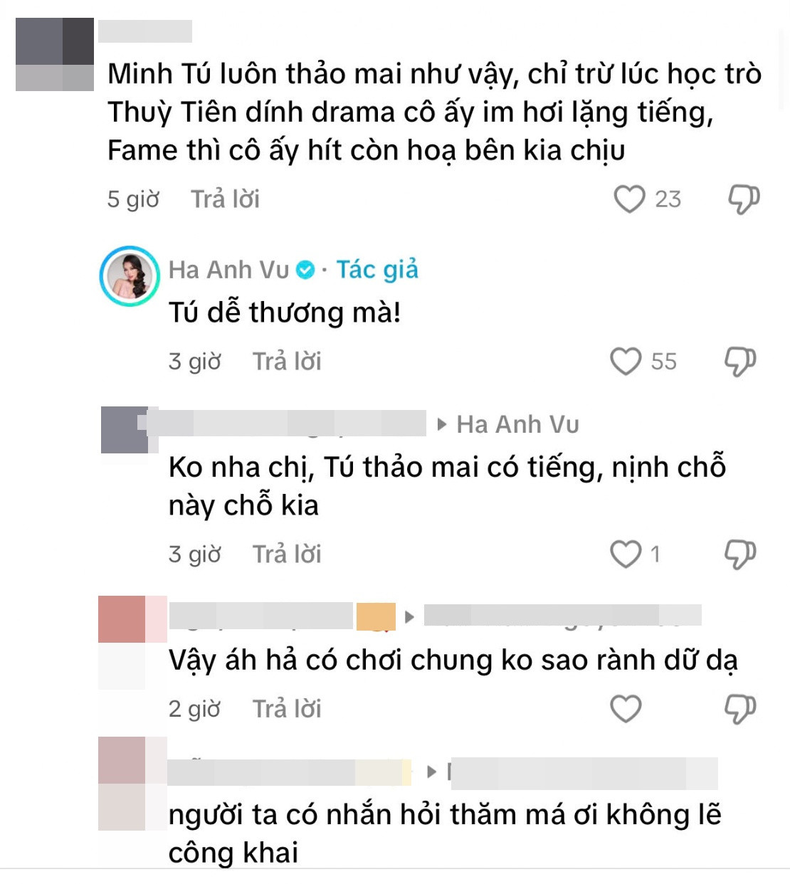 "Minh Tú luôn thảo mai như vậy, chỉ trừ lúc học trò Thuỳ Tiên dính drama cô ấy im hơi lặng tiếng, fame thì cô ấy hít còn họa bên kia chịu", người này mỉa mai.