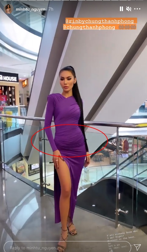 Vòng 2 bèo nhèo mỡ 3 ngấn trong khoảng thời gian Minh Tú cách ly ở Bali. Cô hài hước chú thích: "Khắp thiên hạ vòng eo 56 cm, 58 cm, 51 cm. Đây Thúy Liễu vòng eo chấn động cả hang động".