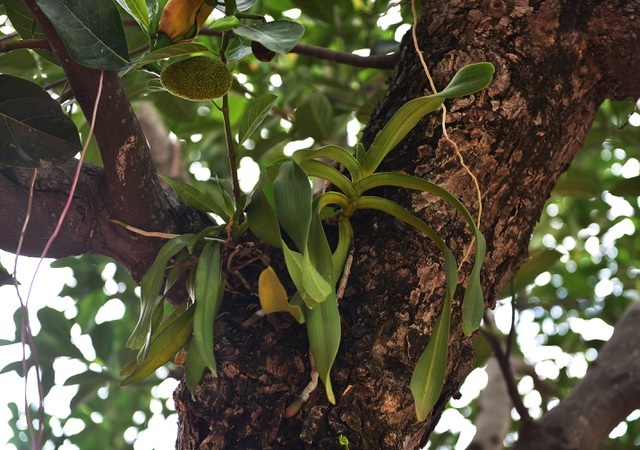 Trên thân cây mít có vô số loài lan quý sống tầm gửi, hoa nở quanh năm và tỏa hương ngào ngạt