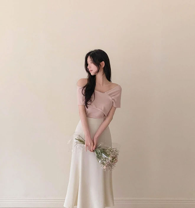 Bạn cũng có thể kết hợp áo trễ vai với chân váy midi, chân váy bút chì, chân váy xếp li hoặc chân váy maxi đều là những lựa chọn hoàn hảo.