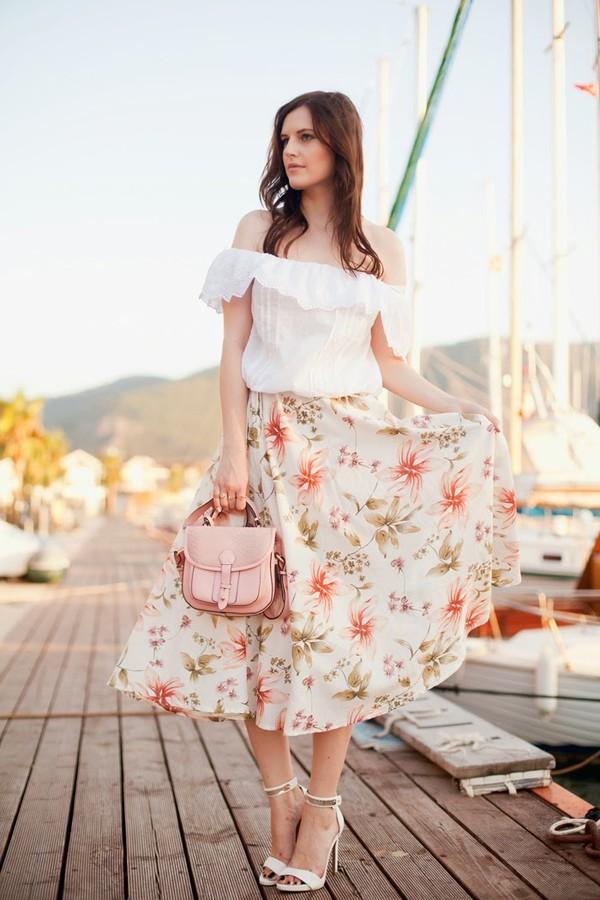 Chân váy xòe hoa điệu đà, nữ tính khi kết hợp cùng áo trễ vai mang đến vẻ ngoài gợi cảm, tính tế cho chị em du xuân.