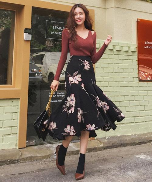 Sexy hơn khi phối chân váy xòe dáng đuôi cá với áo len ôm cut-out phần vai lạ mắt vừa quyến rũ vừa xinh xắn miễn chê.