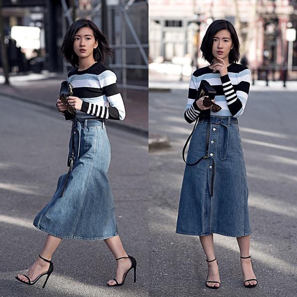 Vẫn là mẫu chân váy denim xòe dài nhưng khi kết hợp với áo thun kẻ ngang ôm sát, đi giày cao gót quai mảnh thì diện mạo của nàng lại trở nên trẻ trung, đáng yêu hết nấc.