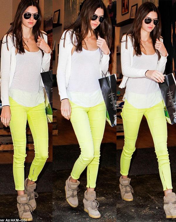 Kendall Jenner trẻ trung với skinny vàng chanh phối cùng áo trắng.