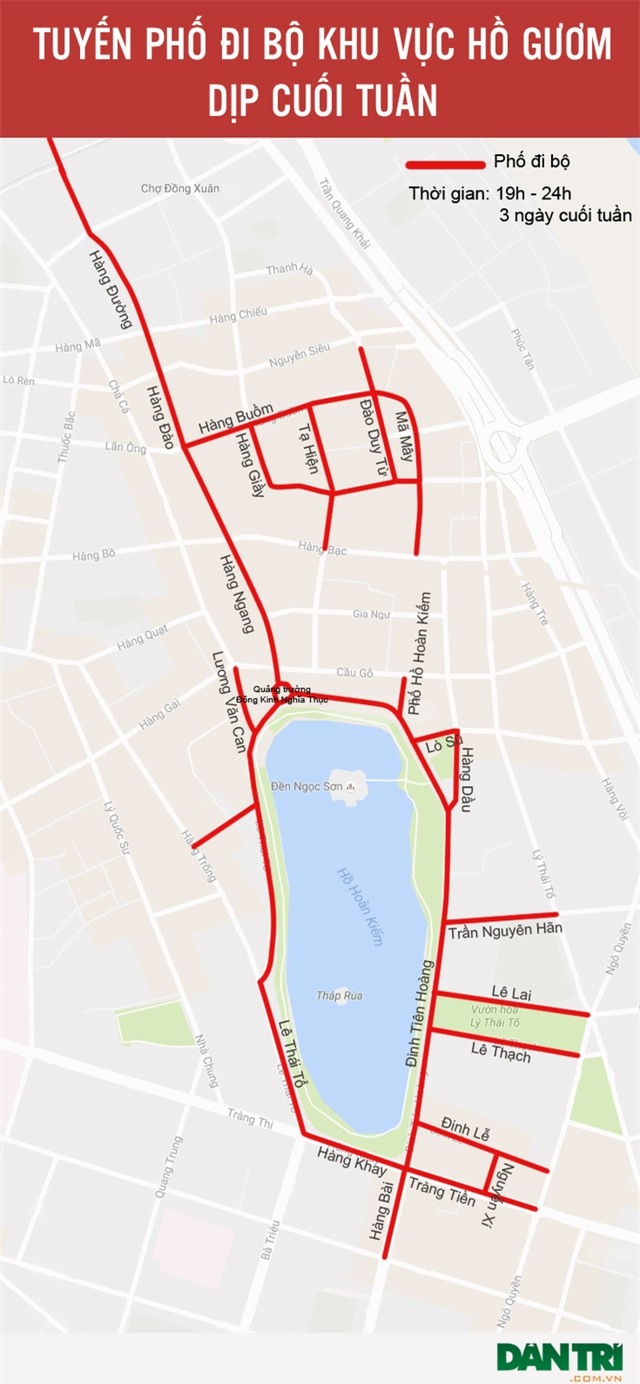 Các tuyến phố xung quanh hồ Hoàn Kiếm được tổ chức thành phố đi bộ gồm: Phố Đinh Tiên Hoàng, Hàng Khay, Lê Thái Tổ (1/2 đường Lê Thái Tổ phía bên hồ Hoàn Kiếm, đoạn từ Hàng Trống đến Hàng Khay), Lê Lai (đoạn từ Đinh Tiên Hoàng đến Lý Thái Tổ), Lê Thạch, Phố Trần Nguyên Hãn (đoạn từ Đinh Tiên Hoàng đến Lý Thái Tổ), Phố Đinh Lễ, Phố Nguyễn Xí, Phố Tràng Tiền (đoạn từ Ngô Quyền đến Hàng Bài) ), Phố Lò Sũ (Đinh Tiên Hoàng đến Nguyễn Hữu Huân), Phố Hàng Dầu (Đinh Tiên Hoàng đến Cầu gỗ), phố Hồ Hoàn Kiếm, Lương Văn Can (đoạn từ Hàng Hành đến Lê Thái Tổ), Phố Hàng Bài (đoạn từ Hai Bà Trưng đến Hàng Khay), Bảo Khánh (đoạn từ Ngõ Bảo Khánh đến Lê Thái Tổ).
