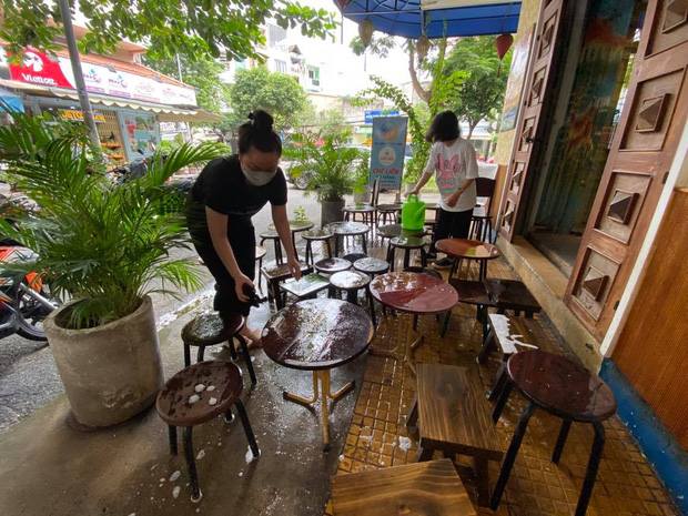 Một quán cafe tại TP.HCM lau dọn bàn ghế chuẩn bị đón khách tại chỗ