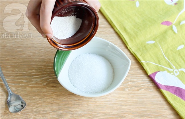 Đun sôi 1l nước. Cho từ từ bột rau câu và đường vào, vừa cho vừa khuấy tan. Vét quanh thành nồi cho rau câu không bị cháy.