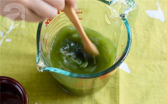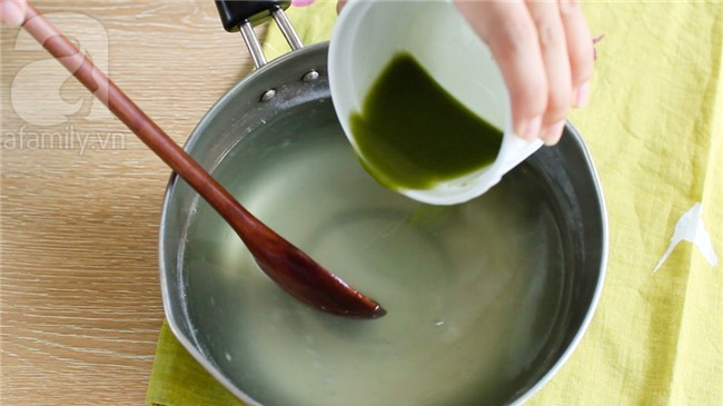 Bạn cho từng phần nước matcha vào đến khi được màu xanh ưng ý. Không nên cho quá nhiều bánh sẽ mất độ trong.