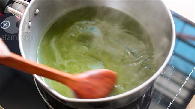 Đợi nước rau câu sôi, vớt bọt. Đem nồi xuống cho nước matcha đã khuấy vào.