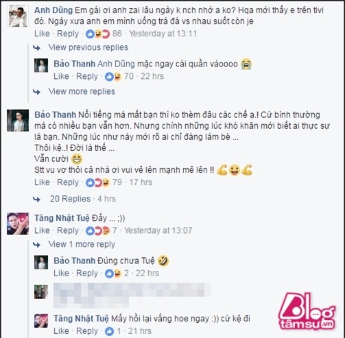 Dưới phần bình luận, Bảo Thanh phân trần thêm: “Nổi tiếng mà mất bạn thì không thèm đâu các chế ạ! Cứ bình thường mà có nhiều bạn vẫn hơn. Nhưng chính những lúc khó khăn mới biết ai thực sự là bạn. Những lúc như này mới rõ ai chỉ đáng làm bè. Thôi kệ! Đời là thế. Vẫn cười. Status vu vơ thôi cả nhà ơi vui vẻ lên mạnh mẽ lên!!”.