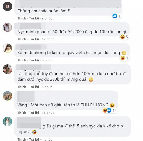Bài viết nhận được sự chú ý của nhiều người. Cư dân mạng bình luận: "Họ đi bao nhiêu thì sau mình đi lại bấy nhiêu thôi, mời người ta đến mừng là còn may ý chứ", "Mâm này rôm rả lắm", "Chồng xem chắc buồn lắm", "Người yêu cũ mình phải tới 50 đứa. 50x200 cũng được 10 triệu rồi còn gì", "Bố mày đi phong bì kèm tờ giấy viết chúc mọc đôi sừng", "Cho tao hỏi động lực gì mời người yêu cũ đi ăn cưới vậy"....
