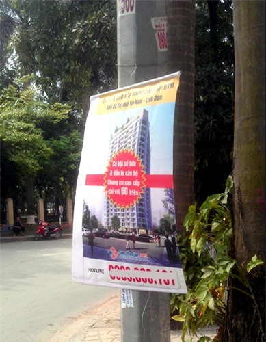Gốc cây, cột điện là những vị trí lý tưởng để những sản phẩm bất động sản giá hàng tỷ đồng neo đậu. |