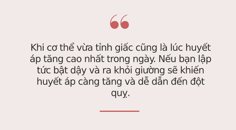 Khi cơ thể vừa tỉnh giấc cũng là lúc huyết áp tăng cao nhất trong ngày. Nếu bạn lập tức bật dậy và ra khỏi giường sẽ khiến huyết áp càng tăng và dễ dẫn đến đột quỵ. Đặc biệt là trong những ngày trời rét đậm, rét hại bạn không nên ra khỏi chăn và xuống giường ngay mà cần nằm lại trên giường, vận động nhẹ nhàng 3-5 phút để cơ thể dần thích nghi.