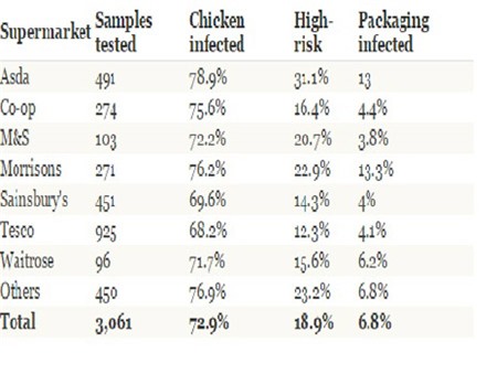 cuộc kiểm tra trong 9 tháng qua tại Anh cho thấy 73% thịt gà trong siêu