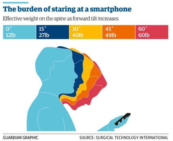 Đây là một hậu quả cực kỳ nghiêm trọng do smartphone mang lại. Dành cho những người chưa biết, nếu đầu bạn nặng 5kg thì khi cúi xuống nhìn điện thoại, cổ sẽ phải chịu áp lực tương đương gần 30kg.