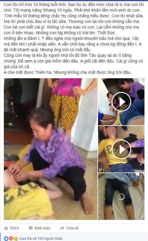 Không chỉ bị đánh đập, cô gái trẻ này còn cho hay mình bị cấm gặp con: “Con tôi chỉ mới 10 tháng tuổi thôi. Sao họ ác đến mức chia rẽ tình cảm mẹ con tôi chứ. Tôi mang nặng 9 tháng 10 ngày. Phải khó khăn lắm mới sinh được con. Tình mẫu tử thiêng liêng chắc họ cũng chẳng hiểu được. Con thì khát sữa, mẹ thì phải chịu đau vì bị tắc sữa. Lại cấm không cho mẹ con ở bên nhau. Những con người không có trái tim. Thất đức”, cô gái trẻ uất ức.