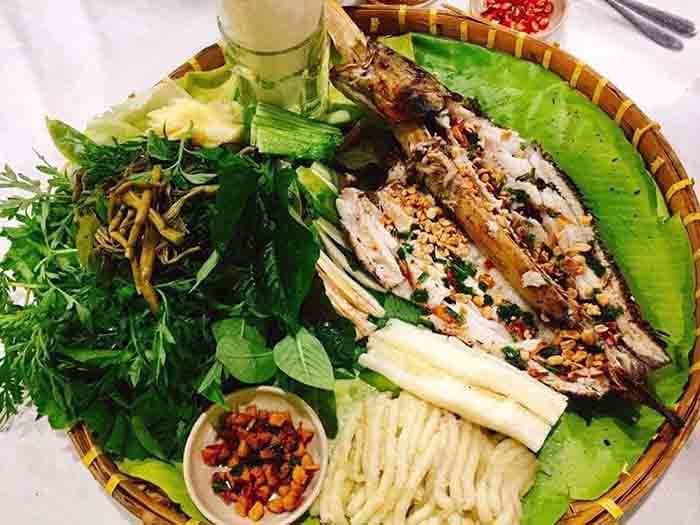 Mỗi con cá lóc nướng mía anh Đạt bán với giá 120.000 đồng kèm rau sống, bún, mắm nêm, bánh tráng để tiện cho khách ăn.