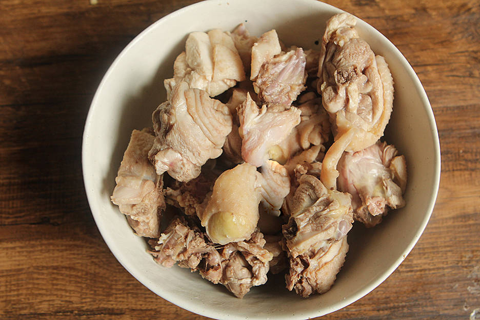 Gà chặt miếng vừa ăn, cho vào nồi nước nóng chần qua rồi vớt ra rửa sạch, để ráo.