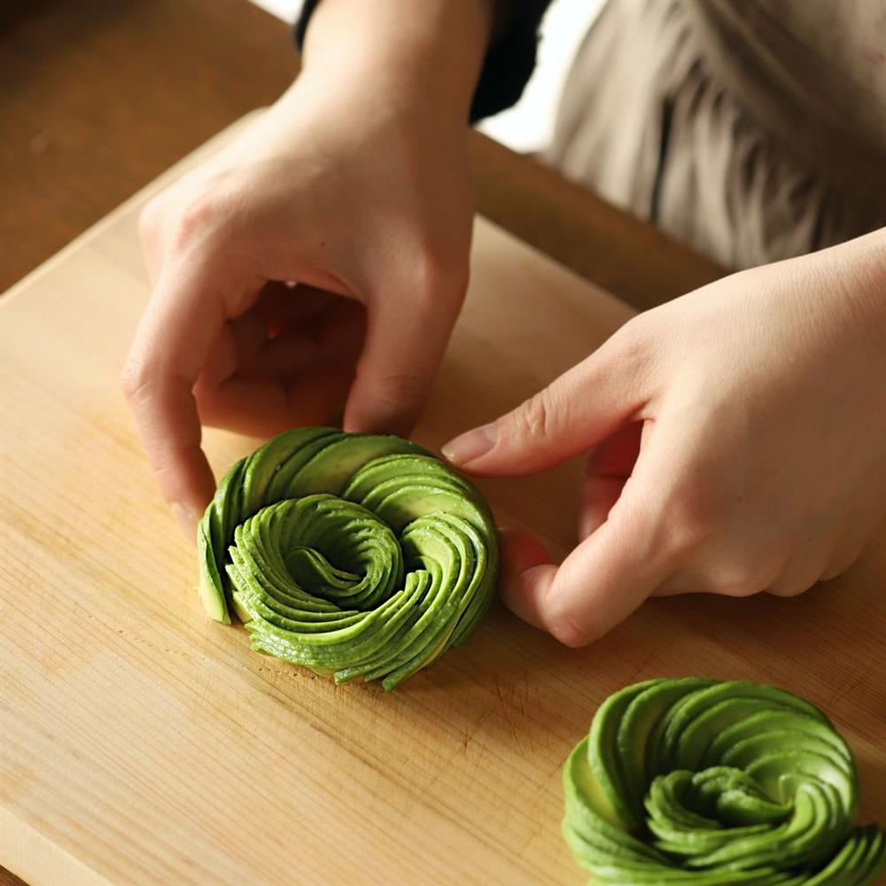 Cắt quả bơ theo chiều dọc rồi vặn để cho bơ tách khỏi hạt. Sau đó tách bỏ phần vỏ quả bơ. Thái thịt quả bơ thành lát đều đặn rồi cuộn tạo hình hoa.