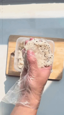 Tiếp theo, bạn cho cơm vào bát cùng 1 thìa canh dầu mè, hạt mè rang và hạt vừng rang (nếu có). Đeo găng tay và vừa trộn vừa bóp cơm thật kỹ. Ở bước này, bạn có thể bóp vụn rong biển và cho vào trộn cùng cơm nếu thích.