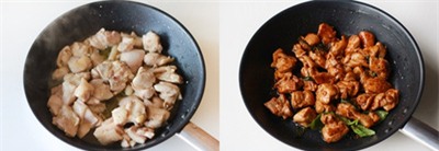 ![]() | ![]() Bắc chảo lên bếp cùng chút dầu ăn. Khi dầu nóng đều thì cho thịt gà vào, đảo đều ở lửa vừa. |