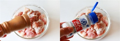 ![]() | ![]() Thịt gà cắt khúc vừa ăn sau đó ướp cùng với tiêu, muối trong vòng 20 phút. |