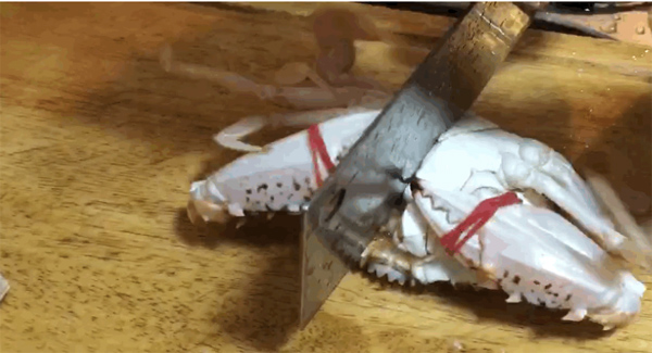 2. Đặt ghẹ trên thớt, mạnh tay cắt đôi ghẹ thành hai nửa.