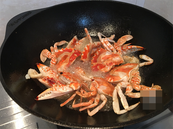 7. Làm nóng chảo, cho dầu và đun dầu trên lửa lớn. Cho ghẹ đã cắt vào chảo.