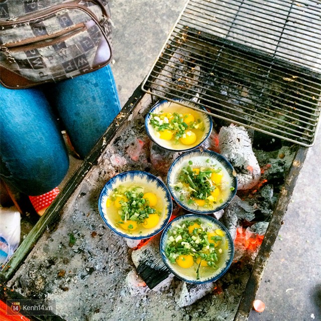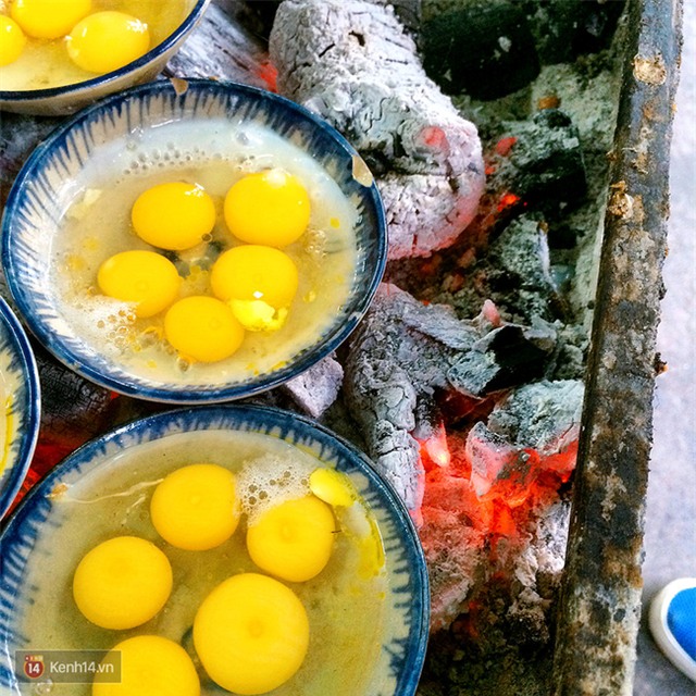 Mỗi một chén là một phần với khoảng 5 quả trứng cút tươi được đổ vào bên trong. Sau đó mới rắc thêm hành lá sống phủ ngập khắp mặt bánh và để từng chén vào giữa bếp than hồng đang cháy đỏ rực bên trong. Một bí quyết mà hỏi mãi chị chủ mới chia sẻ đó là không bao giờ để bánh vào lò lúc than đang nổi lửa. Phải là than đang cháy nhưng âm ỉ, ửng đỏ vừa đủ để tạo nhiệt giúp trứng chín đều và quan trọng là tạo được một lớp vỏ vừa đủ cháy vàng bên ngoài, làm tăng thêm mùi thơm khi ăn.