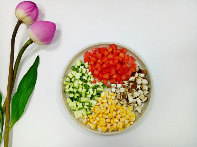 Bạn rửa sạch cà chua, bí ngòi, nấm đông cô rồi thái hạt lựu tất cả. Hành lá bỏ gốc, rửa sạch và cắt nhỏ. Nếu dùng ngô ngọt đóng hộp, bạn không cần rửa qua ngô. Nếu dùng bắp ngô tươi, bạn tách lấy hạt ngô, rửa qua với nước rồi để ráo.