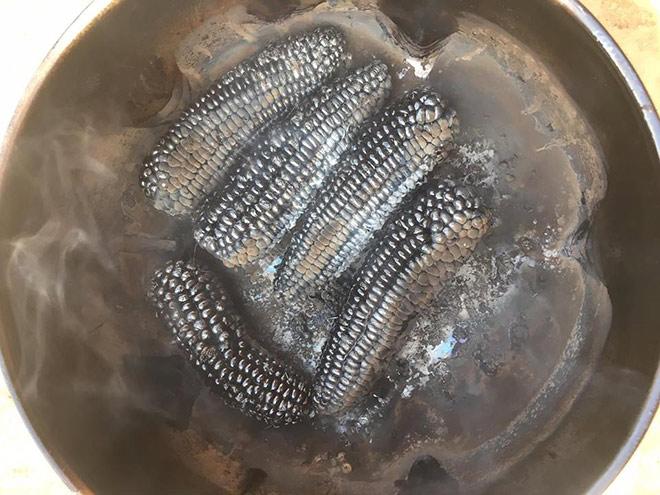 Trong bức ảnh, chiếc nồi cháy đen trơ đáy với 3 bắp ngô nổi bật một màu đen óng ả khiến nhiều người không nhịn nổi cười.