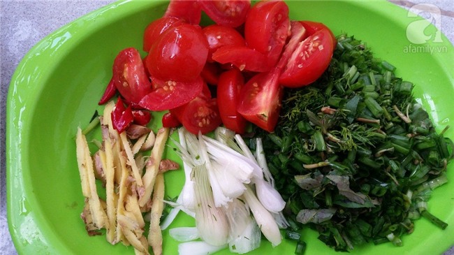 Cà chua rửa sạch, bổ múi cau. Hành, rau răm, thì là thái nhỏ.