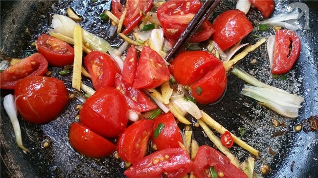 Dùng chiếc chảo vừa chiên cá, cho cà chua, hành vào phi thơm, thêm chút bột canh cho cà chua nhanh nhừ.
